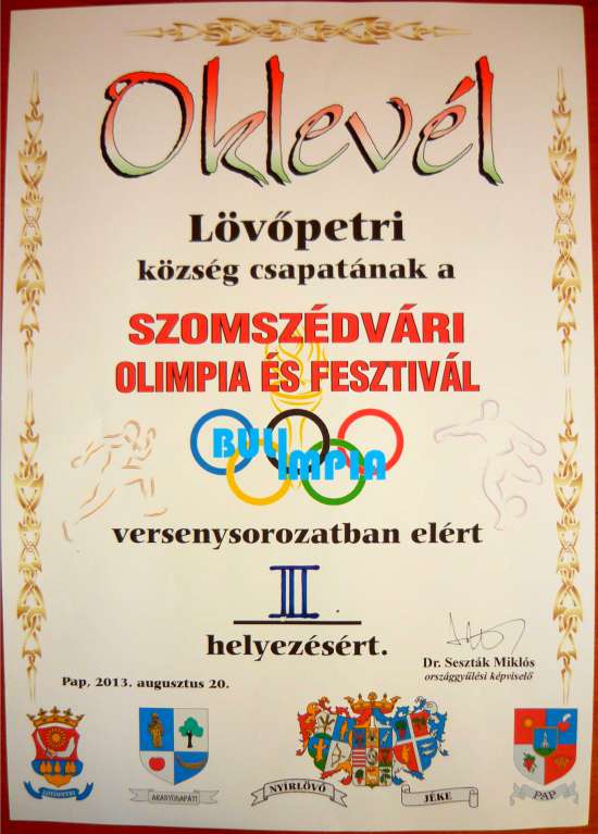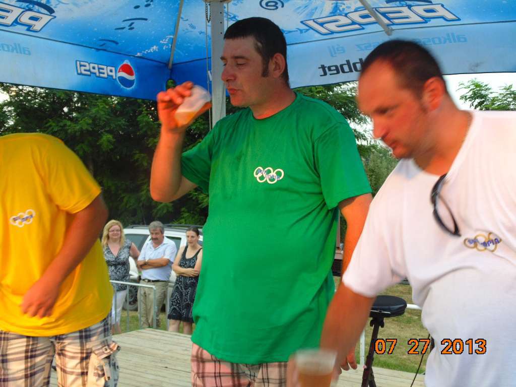 Délután az „Olimpiai” vetélkedésben vehetett részt minden szervező faluból érkező csapattag. A „Szomszédvári Olimpia” versenyszámain településünk csapattagjai sem vallottak szégyent. A dekázásban Kovács László negyedik helyezést ért el. A falu legerősebb embere versenyben Balogh Sándor szintén a 4. helyen végzett. Kötélhúzásban a falu csapata ezüstéremmel büszkélkedhetett. A csapatban Fábián István, Maklári Márk és Éles Gábor szerepelt. Lengőtekében Kovács Barbara a dobogó legfelső fokára állhatott. Négytusában Tordai Fanni vett részt, a harmadik helyen végzett. A palacsintasütő versenyben Nagy Józsefné a harmadik helyet szerezte meg, a palacsinták elfogyasztását Maklári Márkra bízták, aki a negyedikként fejezte be a falatozást. A sakkversenyben kiválóan szerepelt Virágh János, aki megszerezte az első helyet. A vizifociban csapatunk teljesítménye nem fagyott alá, így a második helyen végeztek. A csapatban Kantár Attila, Rakoncza Sándor, Csabina András és Balázs Tibor játszottak. A vetélkedés végére kifulladtak a versenyzők, de a sörivó versenyben pótolhatták a veszteséget. A településünkről Zsell János vett részt a versenyszámban, aki az ötödik helyezéssel zárt.
